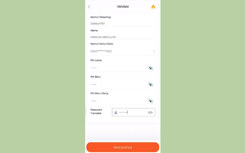 Silahkan di isi dengan benar, isi pin lama dengan benar, lalu isi pin baru dan ulangi lagi pin baru dengan benar ya. Oke pastikan sudah terisi dengan benar, sekarang kita klik selanjutnya.